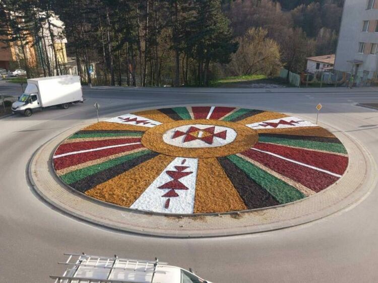 Материалите, които са използвани за кръговото са дървесен мулч и бели овални камъчета. Те се съчетават добре, а цветовете се разделят с ограничители. Под тях има платно, за да няма дървесния мулч досег с почвата. В уникалната композиция са вкарани и чертите на родопската черга, разясни още Гидимаркова.
