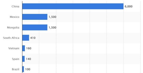 Водещи страни по добив на флуорен шпат в световен мащаб през 2025 г. (в хиляди тона). Кредит: Statista