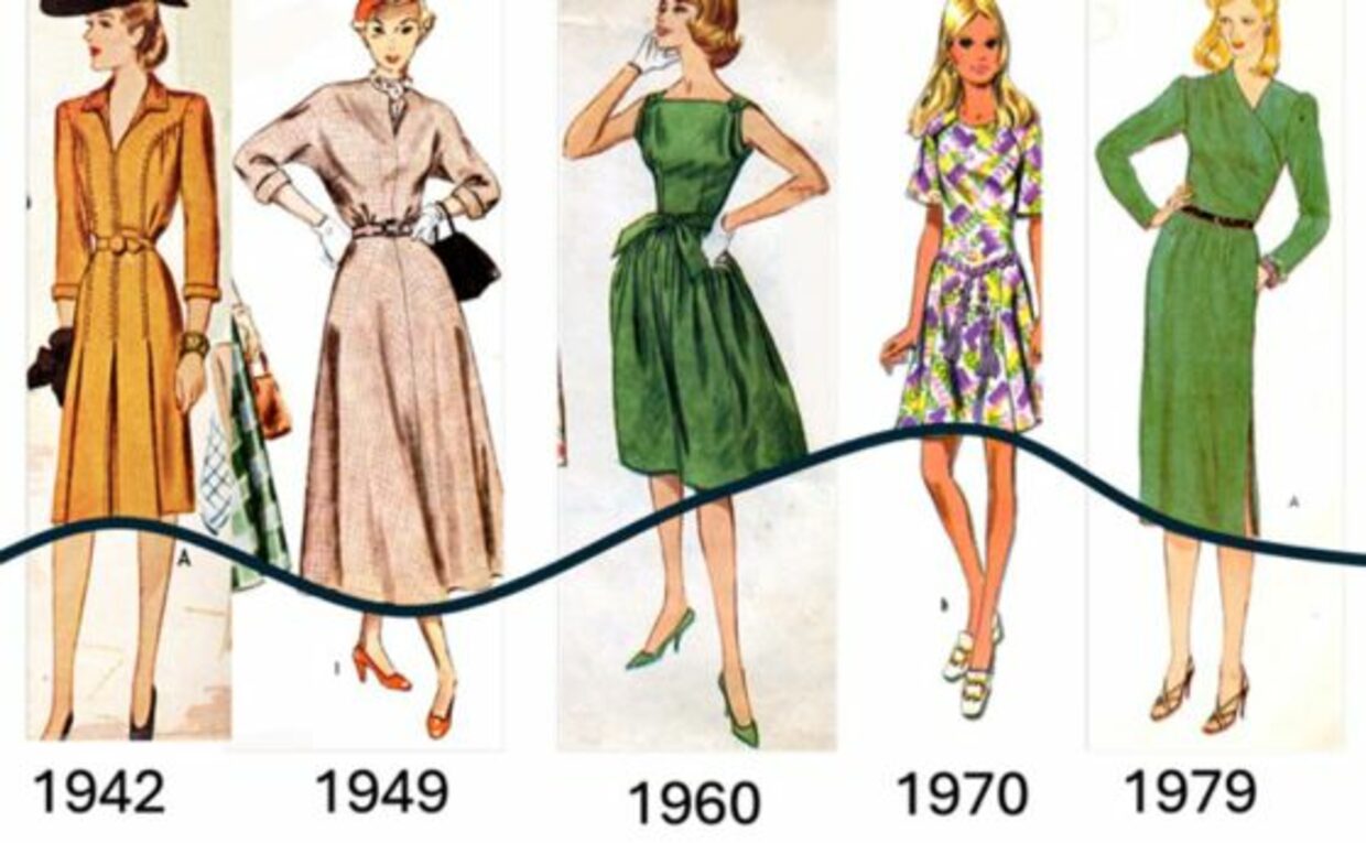 Композитни изображения на популярни модели от 1923 до 1987 г. показват промяната в дължините на дрехите с течение на времето. Кредит: Emma Zajdela/Daniel Abrams/Commercial Pattern Archive