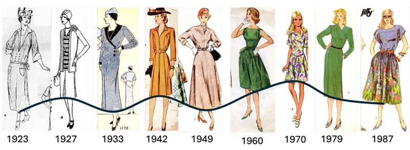 Най-очевидният пример за този модел е подгъвът. Повече от век модата на полите се е колебаела между къси и дълги стилове. Късите рокли с ресни са били на мода през 20-те години на миналия век, но са отстъпили място на по-дългите и понсервативни модели през 40-те и 50-те години на миналия век. До 60-те години на миналия век тенденцията се завръща към още по-къси варианти като минижупа.