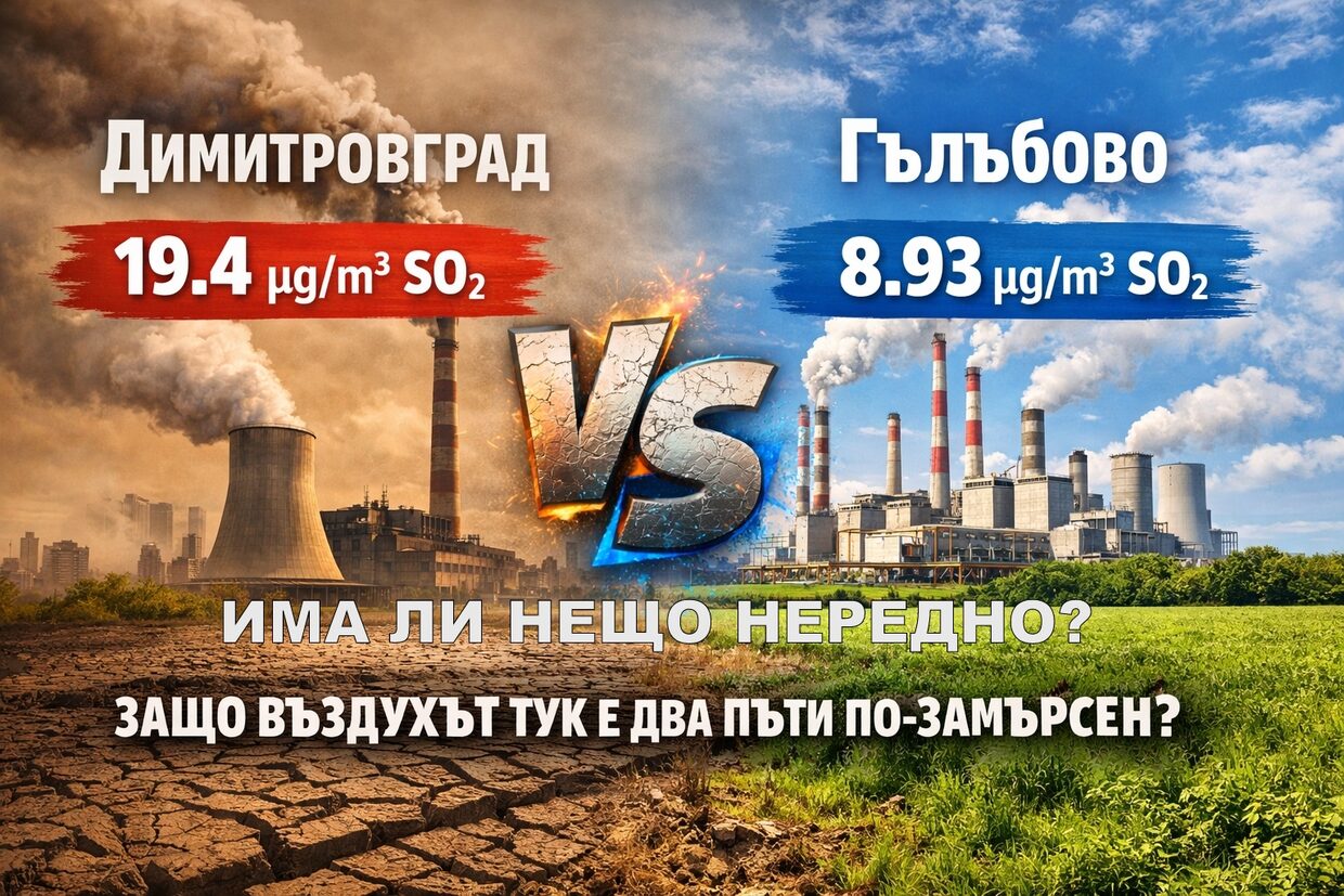 Данни за качеството на атмосферния въздух поставят сериозни въпроси за реалните източници и разпределението на замърсяването в региона на Южна България. Сравнителен анализ на измерванията от автоматичните измервателни станции в Димитровград и Гълъбово показва на пръв поглед необясним резултат: въпреки значително по-малкия индустриален капацитет, въздухът в Димитровград се оказва приблизително два пъти по-замърсен със серен диоксид от този в Гълъбово.