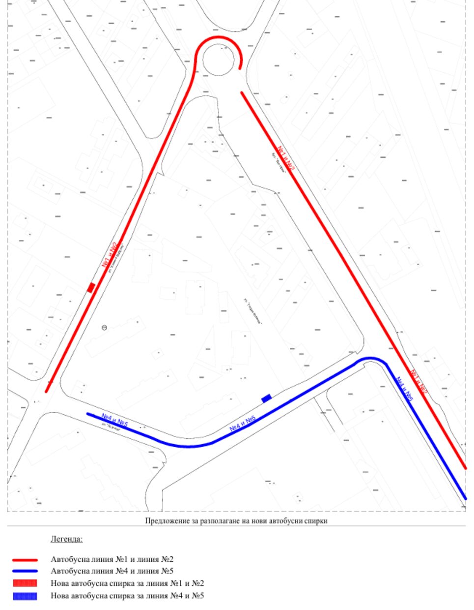 - другата ще е разположена на свободния в момента терен – в близост до ДГ „Зорница“, за линии №1 и №2, чийто маршрут ще бъде през кръговото кръстовище.
