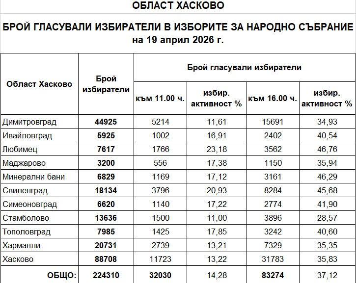 В област Хасково към 16:00 часа днес са гласували 83 274 души от 224 310 избиратели, което е активност от 37,12%.