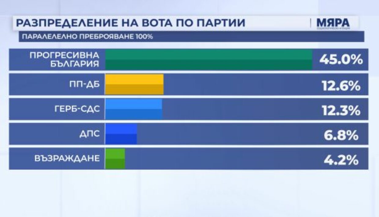 Обрат при паралелното преброяване на 100%, "Мяра": ПП-ДБ изпреварват ГЕРБ-СДС, БСП остават под 4%