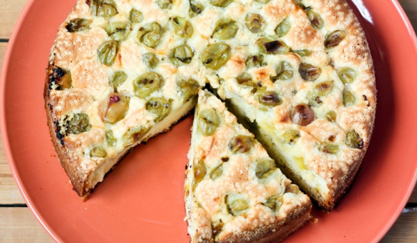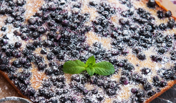 Тестото се разточва леко, слага се в тава, напръскана със студена вода, набожда се с вилица и се пече 25 минути на 200 градуса. Охлажда се. Боровинките се разпределят върху тестото. Лимонът се изцеж...