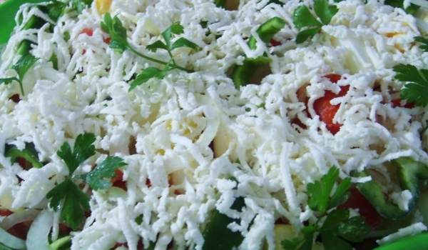 Чушката и лука се режат на ивички, а останалите на кубчета, посоляват се леко. Подреждат се салатена чиния един върху друг, без да се объркват, в следната последователност: най-отдолу са картофите, п...