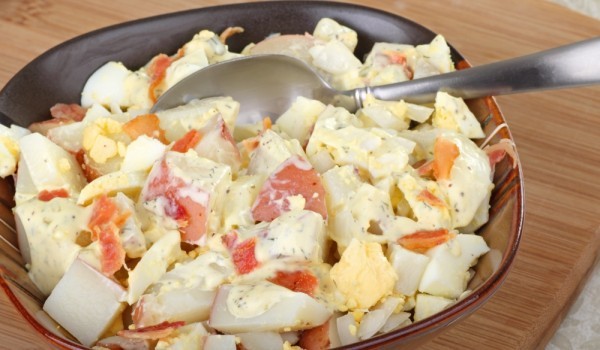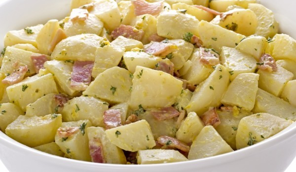Сварете картофите без да ги преварявате, оставете да се поохладят, обелете ги и ги нарежете на парчета. Поставете ги в купа и добавете ситно нарязания, предварително леко запържен бекон и натрошените...