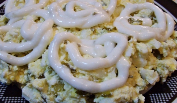 Скумрията се почиства от костите и кожата и се накъсва на малки парчета в купа. Към нея се прибавят нарязаните на тънки резени краставички, и на ивички лук. Овкусява се със зехтин и лимонов сок, и ак...