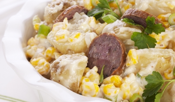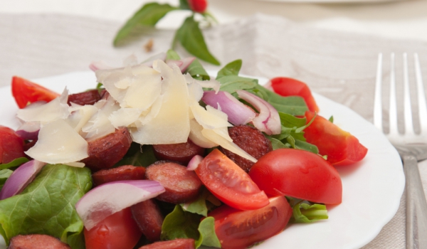 Първо, изпечете наденицата и нарязаната на лентички тиквичка на грил или барбекю. През това време може да приготвите и дресинга, като за целта запържите подправките в тиган, без мазнина, докато станат...
