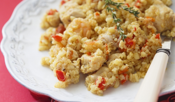 Залейте киноата с около 450 мл студена подсолена вода, кипнете и варете около 15 минути на тих огън. Измийте със студена вода и оставете да се отцеди добре. В дълбок съд смесете киноата, а по желание...