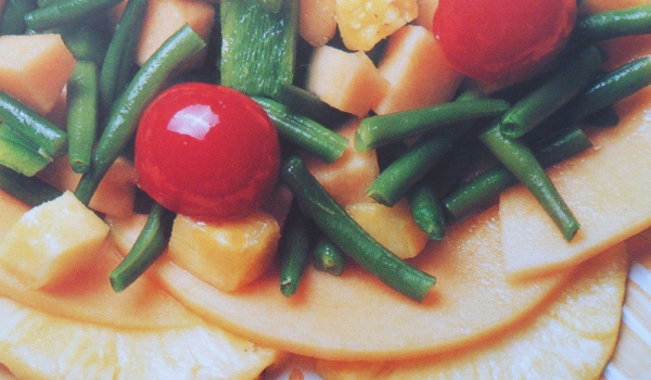 Пъпешът се бели и реже на половинки. Едната му част се реже на кубчета, а другата на тънко. Ананасът се реже на на тънки филии, които се прехвърлят в подходяща чиния за сервиране, а върху тях се прех...