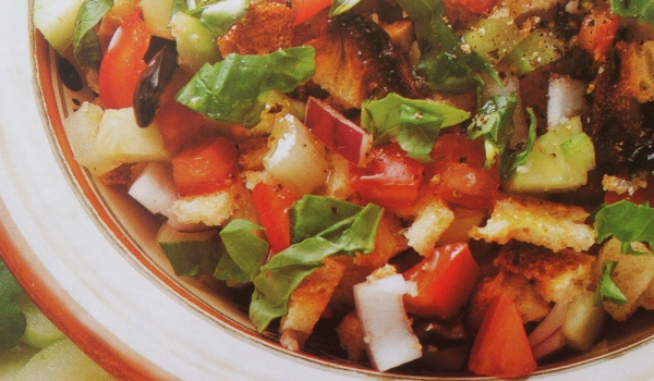 Хлябът трябва да е на тънки филийки и препечен. Натрива се с чесъна. Щом изстине, филийките се режат на кубчета. Доматите се слагат в гевгир и се поръсват със солта за 15 мин. Лимоновият сок, босилек...