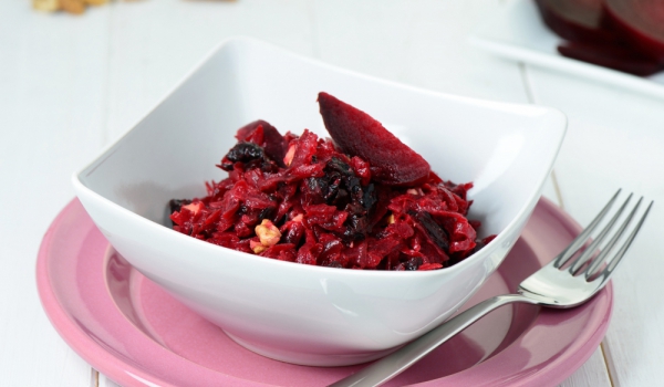 Цвеклото се настъргва на едро. Сините сливи се измиват и се накисват за 30 минути в студена вода. Отцеждат се. Цвеклото и сливите се слагат в тенджерка, добавя се оцетът и захарта и всичко се задушав...