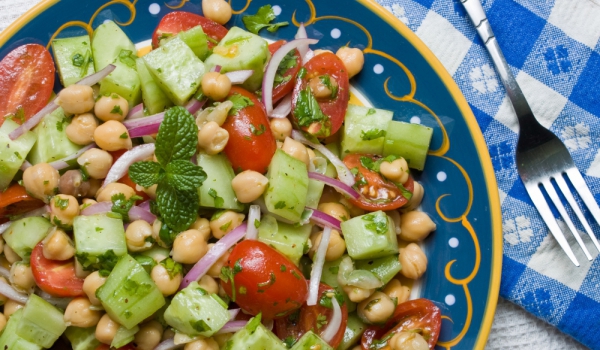 Нахутът се отцежда и се добавят нарязаните на кубчета домати, настърганият на ренде лук, нарязаната на ситно целина и краставицата, нарязана на кръгчета. Поръсва се със сол и черен пипер и се разбърк...