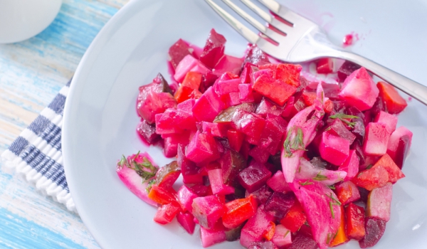 Морковите, картофите и целината се обелват, нарязват се на кубчета и се сваряват в подсолена вода. Отцеждат се и се оставят да изстинат. Добавят се отделно свареното цвеклото, нарязано кубчета, заедн...