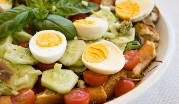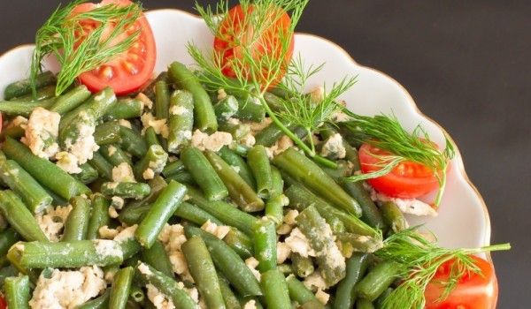 Зеленият фасул се сварява в подсолена вода. Отцежда се и се прехвърля в чиния. Поръсва се с накълцан копър и се залива със зехтина и оцета. Добавя се нарязаният на кръгчета лук, домати и яйца. Салат...