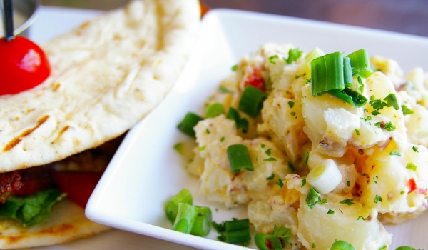 Сварете картофите и ги обелете. Измийте пиперките, сварете ги и също ги облете. Поставете ги в блендер заедно с чесъна, оцета, зехтина и солта. С полученото пюре залейте нарязаните на кубчета карто...