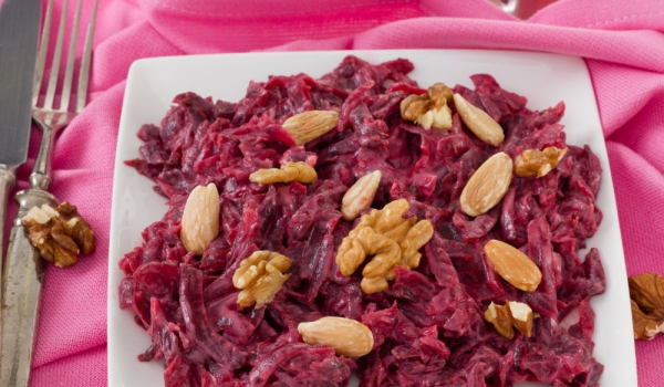 Цвеклото се сварява в подсолена вода и се обелва. Настъргва се на едро ренде и се добавя настърганото сирене, счуканите орехи и чесън. Отгоре се поръсва с настърган на ситно хрян и салатата се залива...