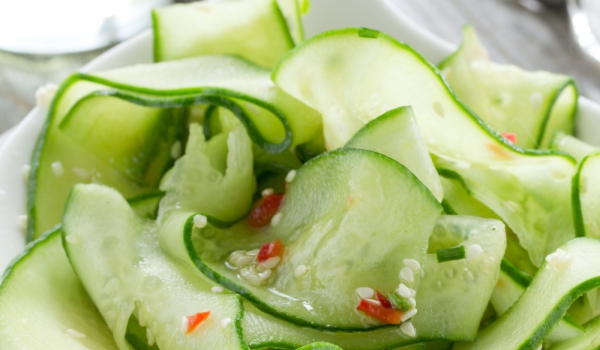 Краставиците се обелват и нарязват на тънки ивички. Посоляват се и се оставят да се отцедят. Приготвя се дресинг от виното, пудрата захар, сусамовото олио и зехтина. С него се поливат краставиците и...