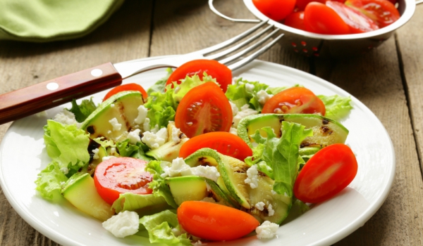 Тиквичките се измиват и се нарязват на тънки кръгчета. Добавя се доматът, нарязан на кубчета, маслините и изварата. Приготвя се дресинг от зехтина, лимоновия сок, черния пипер и солта. С него се поли...