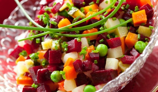 Сварете картофите, но нека останат по-твърди. Бланширайте граха и нарязаните на ситни и равни кубчета моркови. Червеното цвекло се бели и се нарязва на същите малки кубчета. В голяма купа се объркват...