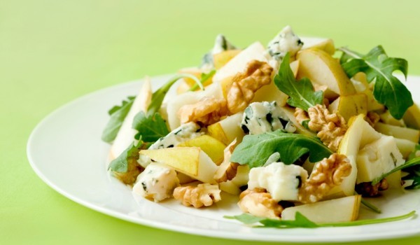 Разбъркайте в купичка оцета, зехтина, лимоновия сок и сол на вкус. В по-голяма купа нарежете на еднакви парченца крушите, добавете няколко листа рукола, поръсете с натрошеното синьо сирене и орехи....