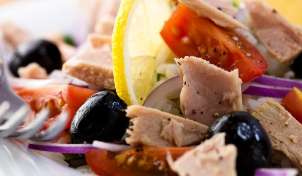 Почистете доматите, нарежете ги на парчета и ги сипете в салатена купа. Към тях добавете нарязания и разделен на полумесеци червен лук, маслините и надробете леко филето от риба тон. Леко разбъркайт...