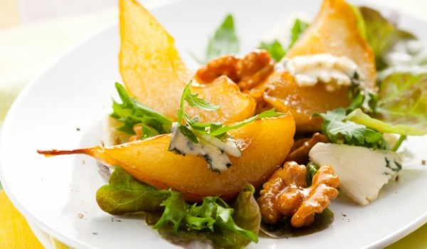 Нарежете крушите на четвъртинки, наредете ги в намазнена тава и ги сложете да се запекат, като ги обърнете и от двете им страни. В 2 чинии сложете по 2 листа маруля, подредете крушите и поръсете с ор...