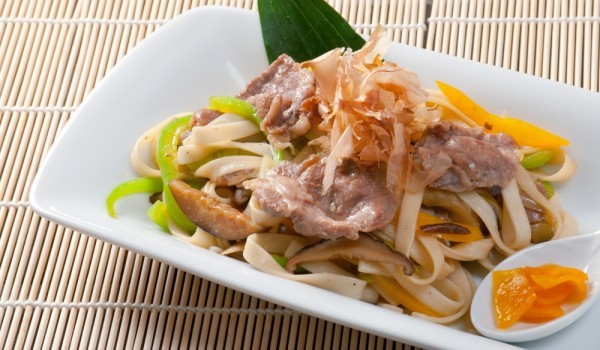 Накиснете сушените ябълки и джинджифил за 1 денонощие във вода, в 2 различни купички, за да набъбнат. При нужда след това ги нарежете на тънки филийки. Сварете нудлите или фетучините и ги изплакнете...