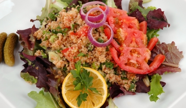 Накиснете булгура за 15 минути в студена вода, след което го отцедете много добре. Обелете доматите и ги нарежете на ситно. Нарежете и чушките, като отстраните семките им. Прибавете зеленчуците, мент...