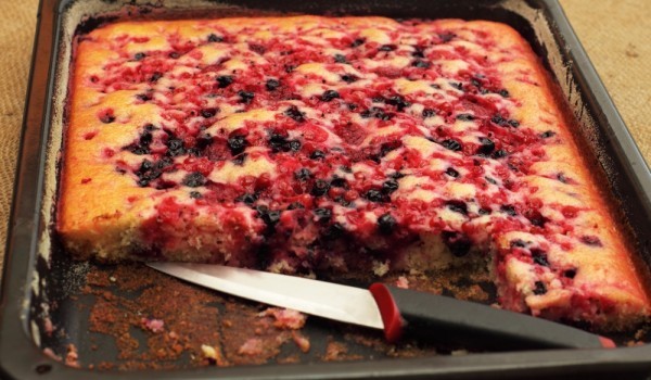 Разбийте маслото със захарта и добавете яйцето и киселото мляко. Пресейте брашното с бакпулвера и ванилията и започнете да го прибавяте, като разбърквате непрекъснато с миксер. Изсипете сместа в гол...