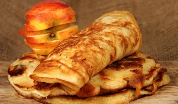 От посочените продукти направете смес за палачинки и ги изпържете. Обелете и почистете ябълките, залейте ги с малко вода, поръсете с част от захарта и ги изпечете в умерена фурна. Когато изстинат ги н...