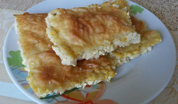 Дъното на тавата се намазва с олио. Слагат се няколко листа кори (5-6) и отгоре се равномерно се ръси част от натрошеното сирене. Отново се слагат няколко листа кори, сирене и така се редуват. Баница...