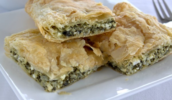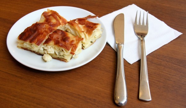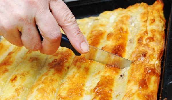 От брашното, водата и солта омесете тесто. Оставете го да престои за малко и след това го разделете на топчета. Всяко топче разточете на тънка кора. Намажете обилно всяка кора с разтопено масло и на...