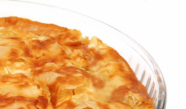 Задушете ситно нарязаният праз в част от мазнината. Прибавете натрошеното сирене, яйцата и черния пипер и разбъркайте добре. В намазнена тавичка наредете две кори, поръсете ги с мазнина и сложете мал...