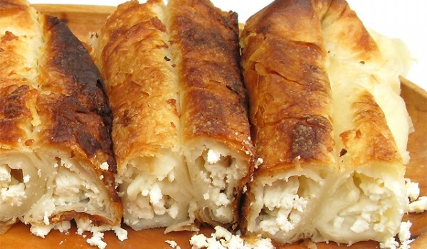 Корите се групират по 4. Всяка се маже с разтопено масло и се слагат една върху друга. Върху четвъртата се слага сирене откъм късата страна и се навива на руло. Нарязва се на филийки с дебелина 2 см....