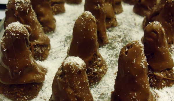 Фурмите се смилат в блендер заедно с нахута, орехите/бадеми и канелата. Прибавя се медът и ромът. Трябва да се получи гъста смес. Оформят се малки топки и се овалват в какао. Съхраняват се в хладилник...