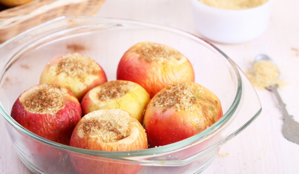 Ябълките се измиват, обелват и издълбават. Оризът се вари в млякото, след което се разбърква с жълтъците, 1/2 чаша захар и канелата. Прибавят се разбитите белтъци. Ябълките се напълват с орехите и о...