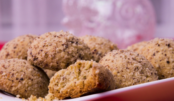 В блендер сложете всички съставки без освен захарта и канелата. Смелете ги. Смесете в отделен съд захарта и канелата. От тестото вземайте малки парчета и ги оформяйте на топчета между дланите си. Го...