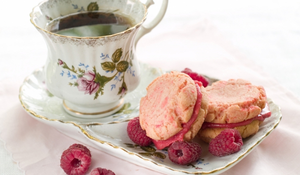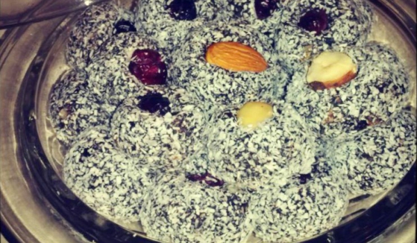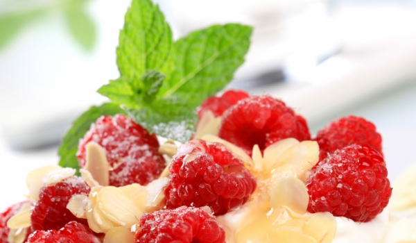 Бадемите се попарват, маха се ципата и ядките се смилат. Десетина малини се оставят настрана за украса. Останалите се намачкват и се смесват с нарязаните листенца мента. Добавят се бадемите и всичко...