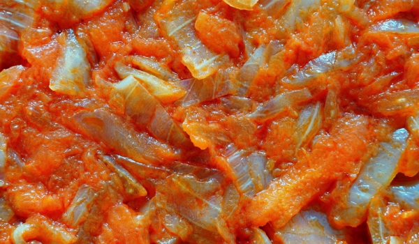 Нарязвате лука на ситно и го задушавате в мазнината и малко вода. Добавяте нарязаните на кръгчета целина и моркови. Когато омекнат сипвате вътре обелените и едро нарязани домати. Продължавате да заду...