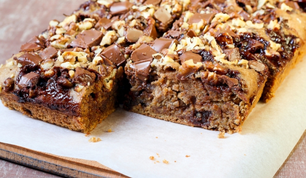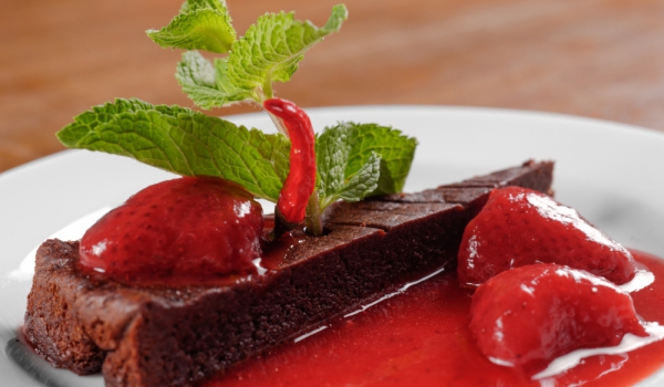 Какаото се смесва със захарта, пресятото брашно, бакпулвера, солта, сладкия и лютия червен пипер и ванилията. Всичко се разбърква, добавя се водата, олиото и оцетът. Смесва се с миксер. Тестото се и...