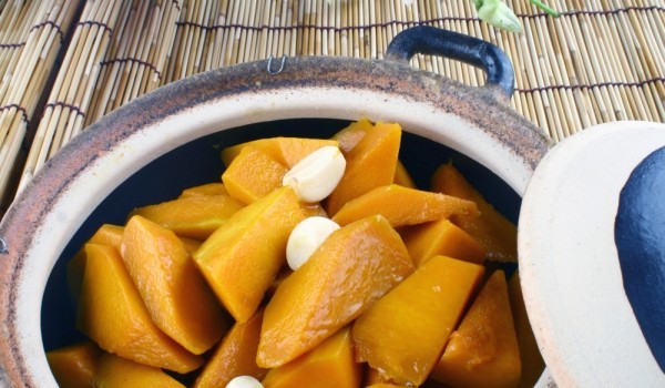 Почистената от семките тиква нарежете на парчета направо с кората. Сложете ги в подмазнена тава и ги поръсете със скълцани ситно чесън, черен пипер, сол и къри. Сложете върху всяко парче тиква малка...