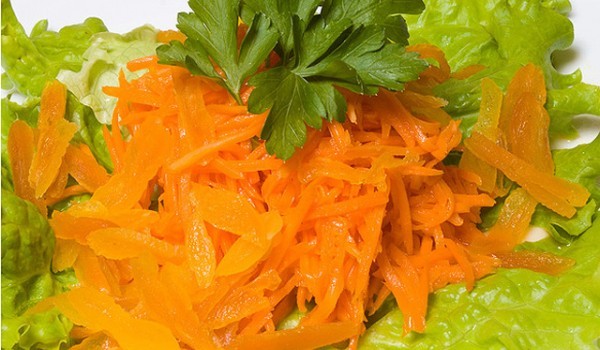 Подберете по-големи, пресни и сочни моркови и ги нарежете на специално ренде на дълги тънки пръчици. Поставете настърганите моркови в купа, овкусете ги с лют червен пипер, смлян кориандър и ги оставе...