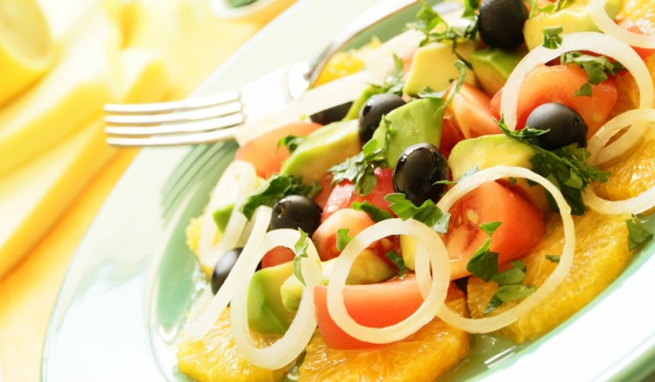 Приготвяме дресинга от зехтина, виното, портокаловия сок и чесъна. Разклащаме добре. След това нарязваме портокалите на тънки резенчета, доматите и червения лук. Смесваме ги в купа, заедно с настърг...