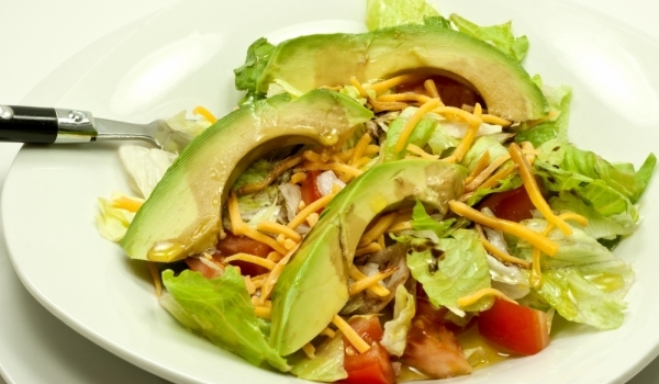 Листата зелена салата се измиват, подсушават и се слагат цели в 4 чинии за сервиране. Авокадото се срязва надве по дължина и се почиства от костилките. Поръсва се с лимонов сок и се напълва със смес...
