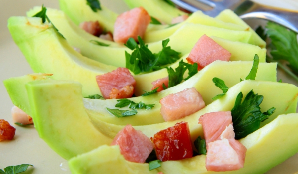 Беконът се запържва до хрупкава коричка и се оставя на хартия. Нарязва се на ситно. Лимоновият сок се смесва с водата, меда и зехтина и се разбива. Добавя се ситно нарязаният лук. Авокадото се обелв...