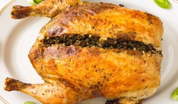 Пилето се измива, добре се поръсва от вън и вътре със сол и черен пипер и се полива с лимонов сок и вино. Зеленият лук се почиства, накълцва и заедно с накълцания чесън се слага да се запържи в част...