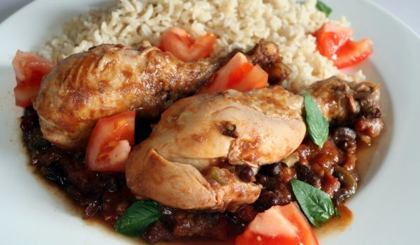 Сложете пилето да се изпържи, докато хване златиста коричка. Извадете го. В тигана прибавете лука и чушките и ги изпържете, докато омекнат. Върнете пилето обратно в тигана. Прибавете доматите. Залейте...