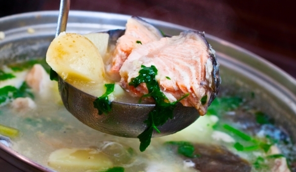 Главата от толстолоб, опашката, перките и месото се слагат да се варят в достатъчно количество вода. Щом месото се свари, извадете да го с решетъчна лъжица в чиния и прецедете рибния бульон. Хубаво о...